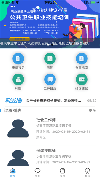 职建学员为社会人员提供丰富的学习课程,涉及多种职业方向,视频直播+回放,形式多样,可线上申请报名,查考勤,申请补贴等等。