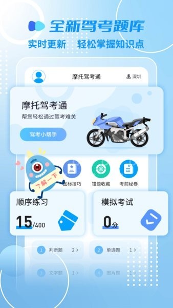 摩托车驾考一点通通实时同步更新2024年驾考科目一、科目四考试题库,通过历年大数据深度分析,精选全国优质驾校供学员学车选择,用科学有效的方法助学员快速通过理论考试,帮学员轻松考驾照!