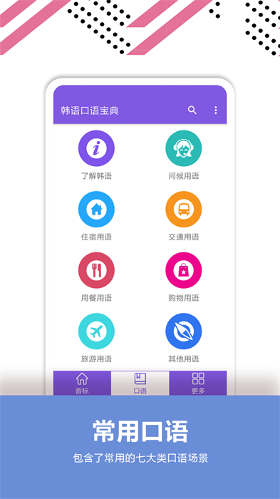 这个韩语口语学习软件真的很方便!里面收录了很多常用的韩语短语,涵盖日常生活的各种场景,比如问候、交通、用餐等等。对于想学韩语的人来说,这款app绝对是个好帮手,特别是对那些计划去韩国旅行或者工作的人来说,简直就是必备工具。