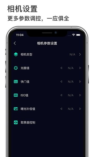 点击相机设置,有6个二级菜单,相机类型、光圈值、快门值、ios值、曝光补偿值...