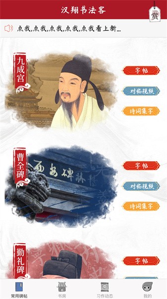 汉翔书法客app,一款专门为广大的书法爱好者们打造的在线学习软件,这里有众多的书法大师在线指导教学,也有众多的电子书法字帖提供给大家临摹练习,为用户带去了智能便捷的学习平台,完全打破了空间限制,让你随时随地想练习就练习,超级的方便好用,有需要的朋友快来下载用起来吧~