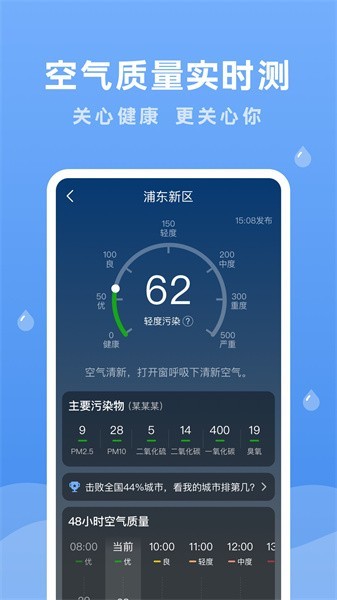 支持2小时内雨雪预测,24小时逐时天气情况查询,未来15日和40日天气、温度、空气质量情况,恶劣天气及时预警。涵盖了6项空气质量指标,9种生活指数,是您平安出行的好帮手!