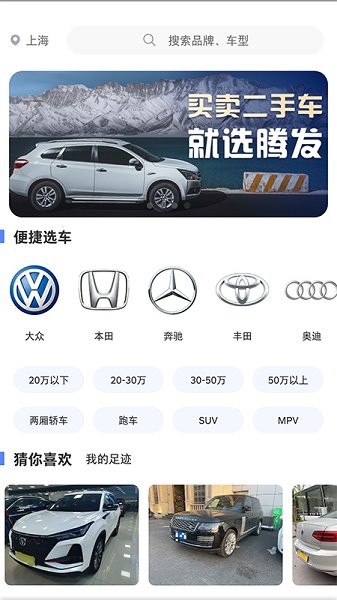 腾发二手车app是超级好用的用户们用来找到超多想要的二手车的手机软件,平台上有超多的二手车资源供用户们挑选,各种品牌的二手车在这里全都能够在这里找到,宝马、奔驰、大众、路虎等等等等在这里全都有,所有车辆的详情在这里全都能够看到,非常好用。