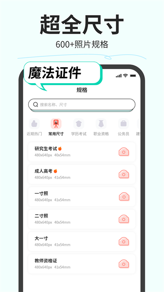 魔法证件照app,一个全新的手机证件照软件,内置丰富多样的模板和尺寸让大家选择,可以被广泛的应用到各大场所当中,用户可以根据自己的需求一键打造所需证件照,超级的方便好用,有需要的朋友快来下载用起来吧~