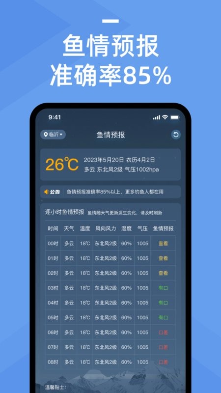 结合钓鱼大师的钓鱼经验,超准超智能的算法,鱼情准确率85%以上