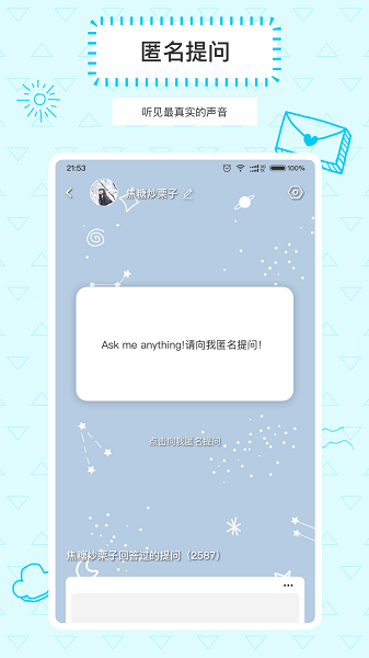 askbox提问箱app是采取匿名方式进行互动问答的应用社交软件,界面清新简单,可以随时随地匿名提问,有趣问答,保护隐私安全,可以放心使用,还支持好友互动,提供个性化的模版使用,任你自由编辑设计,积极参与,即时反馈,提高活跃度!
