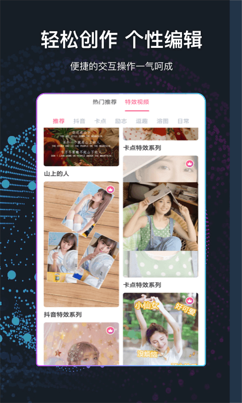 导入视频或者图片,一键制作精彩特效视频和文字视频,主要模版包括爆款音乐卡点视频、书单、炫酷音乐、创意、合拍、情感等。