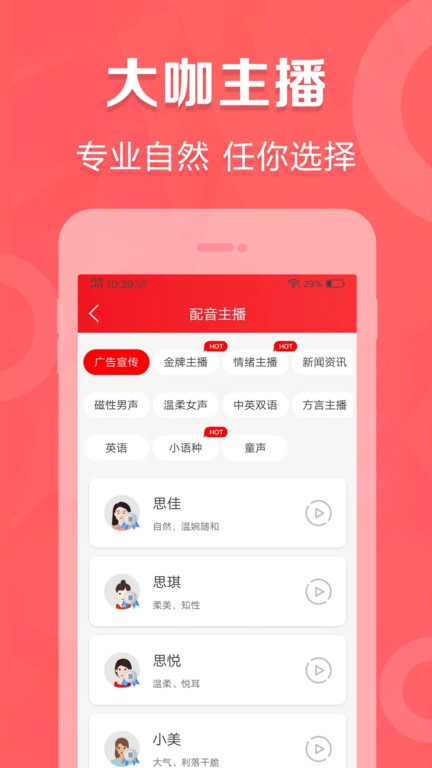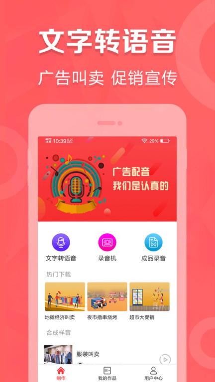 叫卖广告录音app是一款文字转语音合成配音软件,采用智能AI拟人技术,可将文本转化成真人语音,主播声音种类可选择性非常多。覆盖场景广泛,适用于商场店铺广告叫卖配音、地摊叫卖配音、地铁播报等多种场景应用。我们拥有成熟的语音合成技术,海量背景音乐和配音文本模版供您选择,为您打造优质的配音体验!