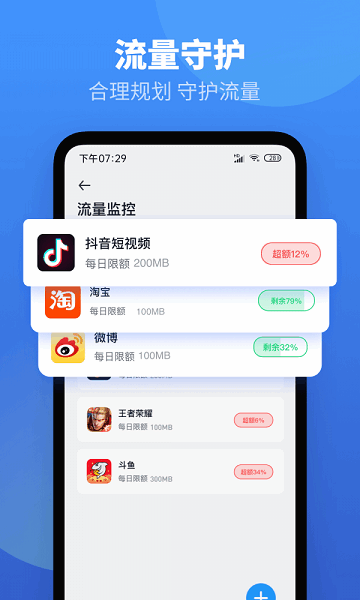 单款app流量监管及提示,有效整体规划运用流量让每一个流量应用都显得有使用价值,合理避免 运用偷跑流量等状况