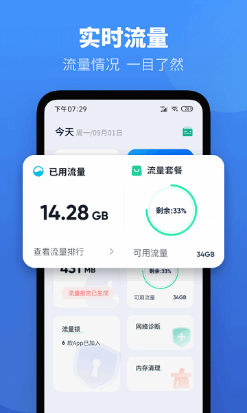 每日流量官方版是专门用来提供流量管理提醒服务的应用软件,不仅可以实时监控手机流量,查看流量使用排行,提供及时预警防护服务,还提供流量分析,网络优化等功能,一键清理垃圾,释放空间内存,操作简单又方便,省时又省心!