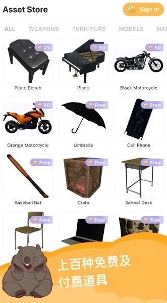 - 上百种免费及付费道具包,包含日系动漫风格的课桌椅,魔幻风的刀剑和盾牌等常用道具!您可以使用我们的应用内货币袋熊币购买模型和道具!