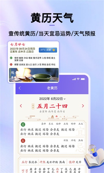 1、日历: 农历、黄历宜忌、节日节气、法定节假日放假安排等;