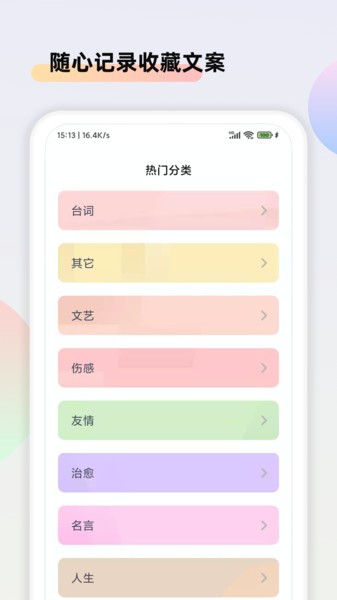 文案助手是一款可以快速借鉴各类现成文案语录的APP,其中分类包含类似诗词、台词、金句、励志、名言、文艺等,还可以自行语音识别、图片识别来提取文案生成文档导出。