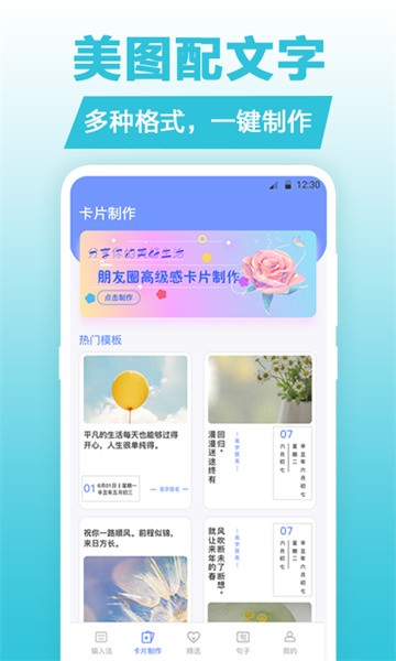 这是集高级朋友圈卡片制作、图片制作、句子、文案、诗句、语录、每日一句的文案素材、朋友圈文案,同时提供不折叠输入法。功能丰富,满足您日常不同的需求。