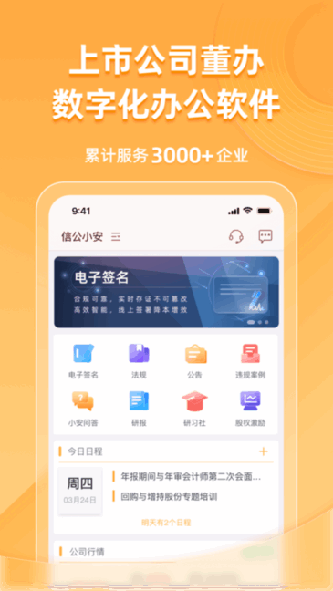 信公小安最新版是提供移动办公服务的应用平台,集电子签名、法规、公告、违规案例、小安问答、研报、研习社、股权激励等功能为一体,日程安排一目了然,公司行情一手掌握,文件管理更加方便,便捷签署,轻松检索,高效管理,不断学习提升!