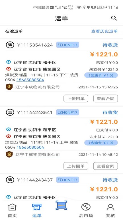3.司机朋友可以随时查看交易情况,交易完成资金秒到账。
