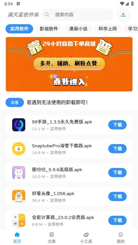 满天星软件库安卓版是提供软件资源的应用工具,涵盖丰富的手机应用,分类清晰,包括实用软件、影视软件、漫画小说、科学上网、学习教育等,随你自由选择,在线搜索,一键下载安装使用,满足不同的需要,界面简约,功能强大,很是实用!