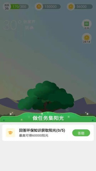 一棵树app是一款环保知识答题种树软件,用户通过完成任务获取阳光种植希望树,升级希望树可以获取金币。同时任务中设有环保答题,在玩家完成任务的同时也督促用户节约资源,保护环境。