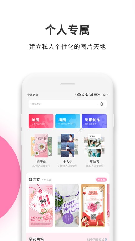 美图拼图、图片DIY、修图改图,拼长图、自由拼图、专业海报模板于一体。生成九宫格图片、翻转或替换图片,按住并拖动可交换图片、捏拉可缩放、拉动把手可调整照片尺寸。 添加精美的背景,贴纸,水印,文字,滤镜等,通过水印、布局、磁贴、滤镜等元素重新组合照片,只需要简单的点击拖动即可完成。