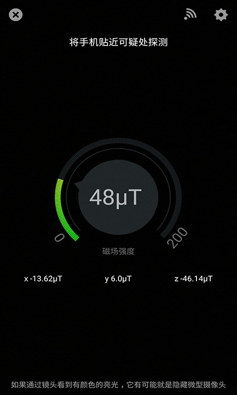 3、软件能够根据手机摄像头的磁场特性,通过“磁场传感器”来进行检测,通过附近的磁场强度分析是否存在偷窥摄像头。