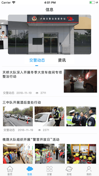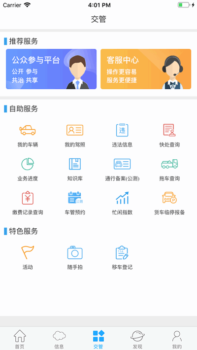 3.交通资讯服务:设出行路况、公告公示、交管资讯三个板块,发布包括号牌公示、业务公告、应急事件、路况信息、重大预警、交通管制、禁行限行,交通路况、交管新闻等内容;