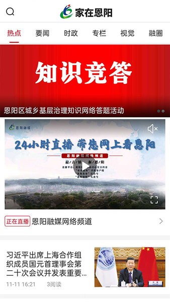 《家在恩阳》手机客户端以提供恩阳区时事、视频和新闻事件直播为亮点,代表了恩阳权威声音,是恩阳时政新闻新媒体主流传播平台。