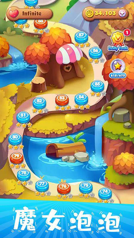 魔女泡泡手游最新版帮助大家用最快速的方式来完成泡泡的消除,经典的泡泡龙游戏就在这里开启,各种模式精彩纷呈,不仅可以解锁全新的泡泡模式,还能够让你的伙伴小妖精来一起玩耍,感受色彩缤纷的世界!