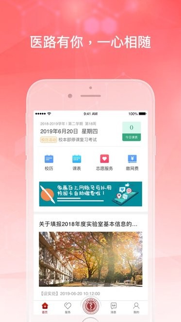 医学部师生可以通过统一身份认证登录APP,APP内包含学生服务、教师服务和公共服务,涉及成绩查询、课表、校历、新闻、薪资及缴费等多方面内容。