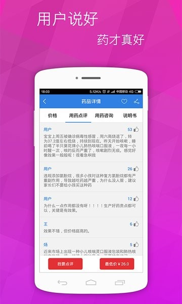 1.药品增加“价格对比”、“用药咨询”、“用药点评”功能,一目了然、轻松操作。