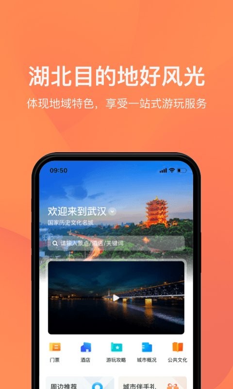 游湖北面向湖北游客和居民,整合全省范围内“食、住、行、游、购、娱”等各项文化旅游资源及相关服务,实现“一站式服务”,让大家享受便捷、品质与实惠;同时,为游客提供权威的湖北旅游资讯、实时的景区景点直播、高效的旅游投诉处置、便捷的导游导览服务和个性的旅游产品预约预订,实现智慧化愉悦体验,让游客“一机在手、畅游湖北”。