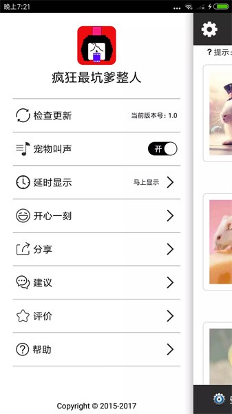 整人宠物恶作剧app是能够让自己使用手机进行恶作剧的软件,在这里用户们能够自由的在手机屏幕上显示各种各样的动物用来整蛊自己的朋友,让他们吓一跳,超多的动物图片能够自由选择,超级的好用。