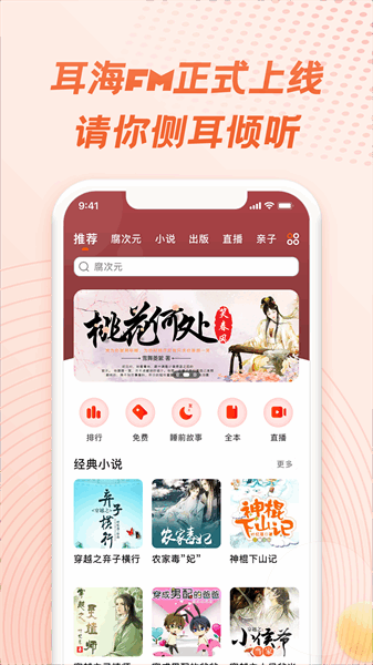 好书用听的,解放你的双手和双眼。耳海FM是一款移动有声小说阅读平台,提供免费听书等数字内容收听服务。其拥有海量热门耽美IP小说和有声数字内容的录制、上传、分享的完整产业链,正成为国内知名的有声数字内容分享平台。