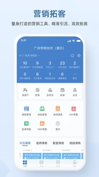 学邦技术boss校长安卓版又称学邦系统、学邦boss官方正版,作为全方位的教学管理运营软件,可以在手机上录入新的学员信息,支持进行班级、学员和课程管理,能偶查看班级、教室和老师的详细课表安排,支持在手机上点名,可以分配和跟进客户,支持修改客户信息,能够批量进行处理。