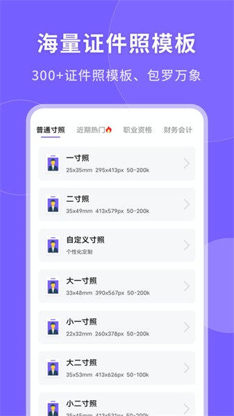 包含1寸、2寸、3寸、4寸等常规尺寸还含有英语四六级、BEC商务英语热门尺寸,同时提供百余种官方指定证照规格,如:毕业照、学位照、入学照等学生证照;会计、考研、计算机、公务员、医护、考研、幼师及语言类考试证照;还有社保、签证、简历、驾照等其他类满足您的各类拍摄场景需求。软件智能推出当下热门的证件照尺寸,让你更快捷高效的用手机制作证件照!