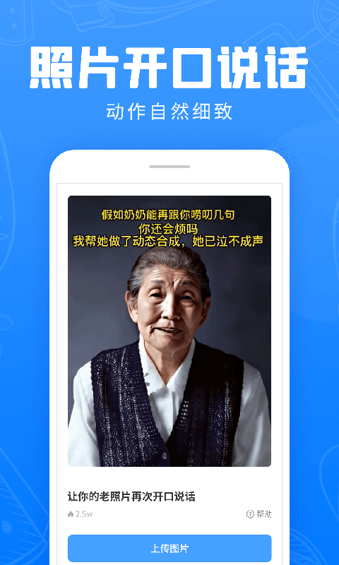 动态老照片,“一键”让你的照片活过来。通过人工智能技术,让照片中的人物在你眼前微笑,还能加入开口说话效果。同时支持将老照片修复上色自动合成一段照片视频。