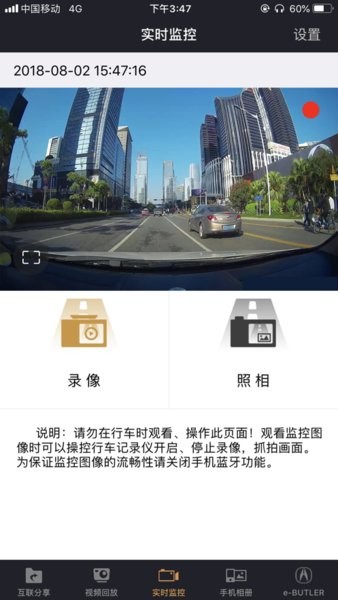 主界面:可实时查看当前行车记录仪的图像显示,控制其录像、拍照;