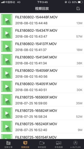 设备文件:将设备中的视频文件以列表形式展现,点击后可播放视频文件,还可删除或下载到手机;
