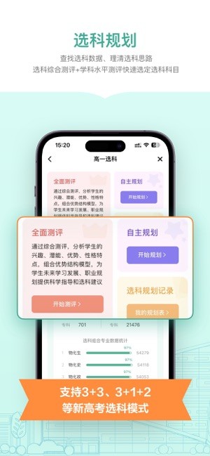 帮助新高考省份考生查找选科数据、理清选科思路,通过选科综合测评和学科水平测评快速选定选科科目,支持3+3、3+1+2等新高考选科模式。