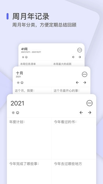 丰富的时间维度让反思日记真正成为我们自我提升的得力助手,通过年月周日层层递进的规划与总结系统进行规划、行动和复盘。一步步分解并实现你的人生目标。