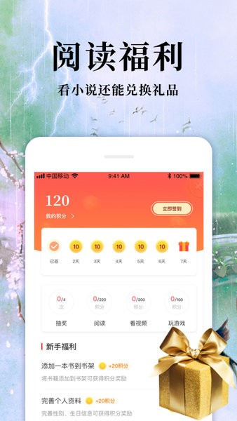 1. 新人有礼,阅读时长送好礼,积分签到,免费小说每日精选推荐