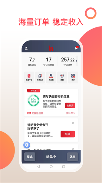和行加盟司机APP,一款专门为广大的司机用户们打造的在线接单神器,平台上有海量的订单提供给大家选择,让司机们可以根据自己的情况一键接单,为用户提供上门接送服务,且软件中的汽车类型也多样,不管是专车还是团体用车,全程都有哦,超级方便实用,可以极大地提供司机们的工作效率哦,有需要的朋友快来下载体验吧~