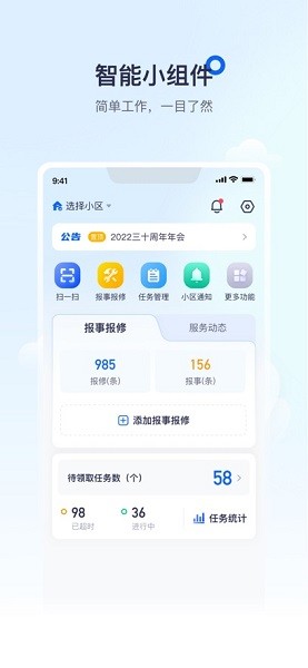 绘管家物业管理平台是一款提供物业管理服务的办公平台,集扫一扫、报事报修、台账、抄表管理、安保巡逻、任务工单、收费、档案管理等功能为一体,带来全面的物业管理体验,社区动态实时更新,统一管理,及时统计分析,数据一目了然,实时记录,高效办公!