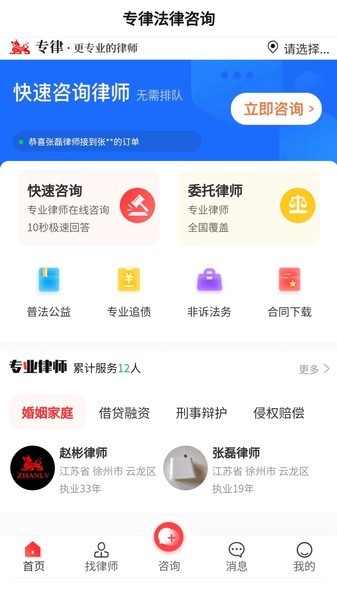 专律法律咨询平台是专门提供法律服务的应用软件,入驻了大量专业的律师,精选推荐,自由选择,在线了解,还支持不同类型方面的法律咨询,提供电话咨询、文字咨询多种方式,更有普法公益、专业追债、非诉法务、合同下载等服务体验,满足用户需求!