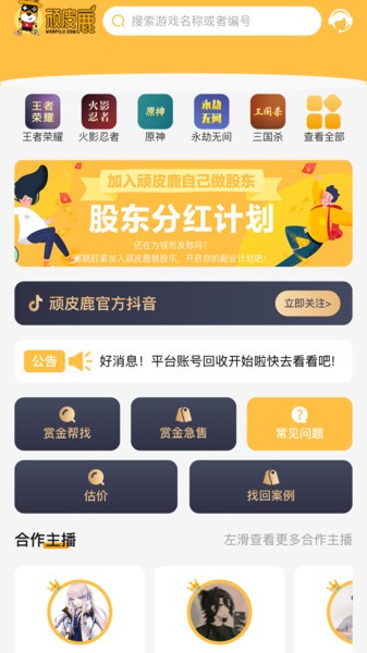 最近我下载了顽皮鹿这个App,感觉挺不错的。它是一个专门做游戏账号交易的平台,界面设计得很清晰,操作起来也很方便。里面支持各种类型的游戏账号买卖,比如手游、端游还有steam之类的,资源很丰富。