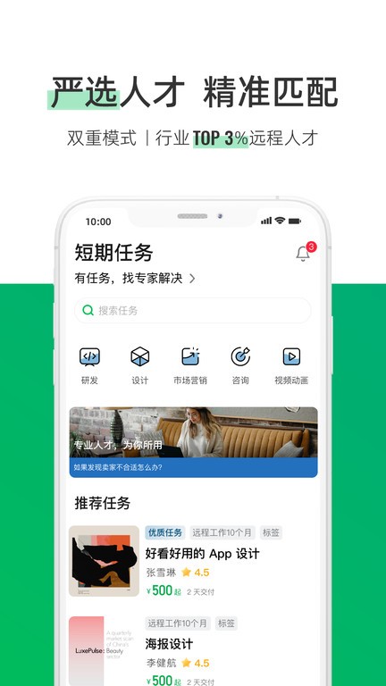 通过线上面试与人才签约,平均可在3个工作日开展工作。明确的需求对应合适的人才,避免大量时间用在无意义的简历捞人和沟通。从发布需求到签约,快速帮助企业搭建团队。