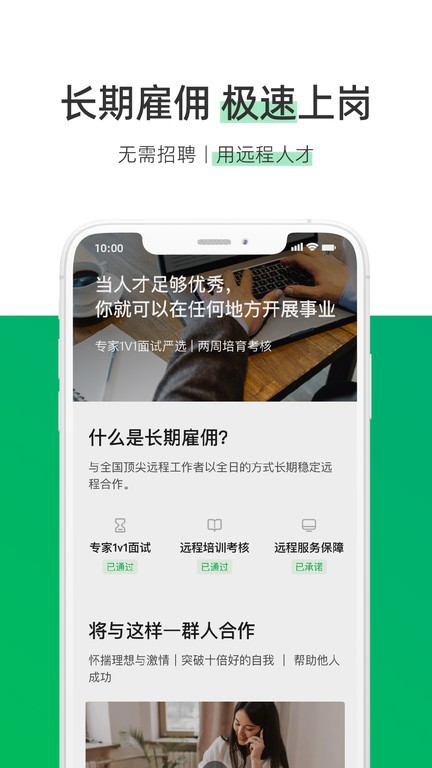 圆领人才全部经过三大筛选流程,只留优质远程人才。企业合作全流程都将由专业的远程顾问指导,企业/雇主免费快捷发布用人需求后,平台通过AI智能算法进行工作双向推荐。