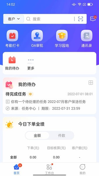 销售人员可以方便的获取所需信息。如:查看附近的客户、今日任务、业绩报表、及各类工具。可有效帮助销售人员获取必要的支持,加快下单过程,提升销售业绩。