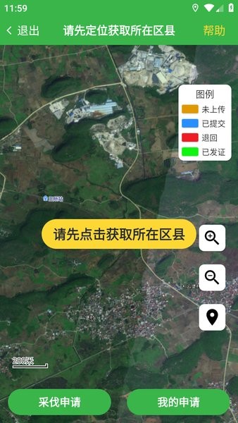 6.点击采伐采集区域按钮,进入行走采集页面,GPS定位精度在5米以下开始行走采集,完成后保存返回申请页面,自动计算采伐蓄积,如采伐蓄积超过限额,则提示不能申请。