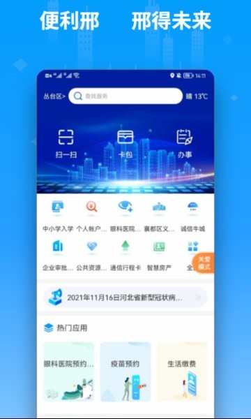 便利邢综合城市APP是拥有史上最丰富功能的城市服务软件,让用户一款软件就可以享受非常多的功能,用户通过软件随时都可以享受更便利的智慧生活,快来下载试试吧!