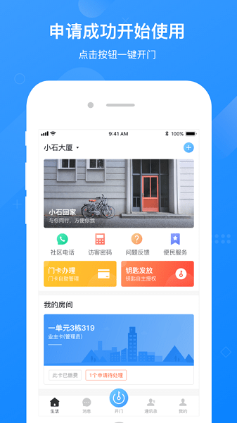 小石回家门禁软件是非常好用的一款手机社区服务app,在这里用户们能够找到各种便捷的功能进行使用,开门禁、门卡办理、社区电话、访客密码、钥匙发放、便民服务等等等等在这里全都能够找到,让用户们能够通过平台更加便捷的生活着小区里,超级的好用。